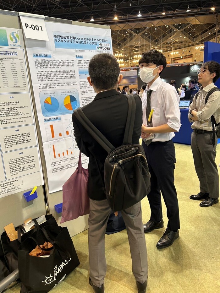 大会1日目に「味評価装置を用いたタミフルの苦みをマスキングする飲料に関する検討」という題目でポスター発表を行いました。タミフルはインフルエンザウイルス感染の治療に用いる薬であり、苦みが特徴的な薬です。薬の苦みは小児患者が薬の服用を継続していく中で大きな障壁で、服薬を中断する理由にもなっています。その苦みを軽減できる飲料について味評価装置を使って調べ、発表しました。結果としては装置上ココアが一番苦みを感じさせないという結果になりました。ポスター発表では小児科の門前薬局に勤務している薬剤師にお越しいただき、意見交換など行うことが出来ました。